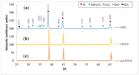 All the starting powders have been consolidated by SPS, and the XRD patterns of the starting powder 15G1 and sintered samples 15G1-SPSed and AA7075-SPSed are reported in Figure 6. For the starting powder 15G1, Figure 6a shows intense Al peaks and weak peaks attributed to the various compounds initially present in the G1/EAFD powder (Figure 2a), even for this sample with 15 wt. % G1. The similarity between the XRD patterns of 15G1 starting powders (Figure 6a) and the 15G1-SPSed sample (Figure 6b) suggests that no reaction took place during sintering as no new phase was detected. The XRD patterns of the sintered G2/EAFD—AA7075 composites have similar features (not shown). The XRD pattern of the AA7075-SPSed is shown in Figure 6c.