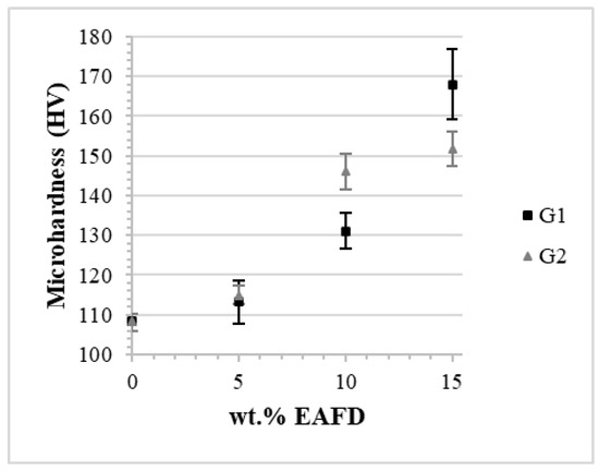 The Vickers microhardness (Figure 9) increases considerably upon the increase in EAFD content, from about 110 HV to 170 HV (with G1) and 150 HV (with G2), thus 55% and 40% higher than AA7075, respectively. The strengthening mechanism is possibly oxide dispersion strengthening (ODS). The high concentration of Fe and Zn enables the formation of high-hardness oxides. The dispersion of oxides in the matrix contributes to impeding the movement of dislocations, thus increasing the strength and hardness properties. In previous work, Alves et al. [15] strengthened the AA7075 alloy by adding EAFD using a conventional powder metallurgy technique of cold uniaxial pressing and sintering in a furnace subjected to a nitrogen atmosphere. Under established experimental circumstances, the inclusion of 5% EAFD resulted in a considerable increase in Vicker microhardness (HV), from 85.09 to 124.6, compared to the unreinforced alloy. The addition of waste to the aluminum matrix increased the average Young’s modulus (GPa) values. The Young’s modulus (E) values found for the AA7075 alloy and the AA7075-5%EAFD composite were 35.51 and 70.48 GPa, respectively.