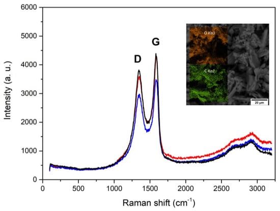 21]. The surface morphology and concentrations of the chemical elements in the GO samples were obtained by Tescan Vega SBH3 (Tescan, Brno, Czech Republic) Scanning Electron Microscope (SEM) equipped with an Oxford Instruments AZtecEnergy energy-dispersive X-ray spectroscopy (EDS) system. The SEM micrographs of the GO produced are shown in inset in