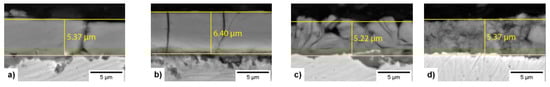 The electrochemical behavior of the samples was investigated using the IPC Pro MF potentiostat (Volta, Saint Petersburg, Russia) with FRA2 module in 0.5 M NaCl and 0.1 M Na2SO4 + 0.02 M H2SO4 solutions at (25 ± 2) °C. The samples’ working area was 1 cm2. A three-electrode system was employed in which the samples served as a working electrode. Platinum and Ag/AgCl electrodes were used as the counter and reference electrodes, respectively. Potentiodynamic polarization curves were measured from the cathodic (−1000 mV) to the anodic (−100 mV) region with a scan rate of 0.3 mV/s. The corrosion current density and corrosion potential were determined from Tafel fitting. The corrosion rate was calculated according to ASTM G 102-89. The electrochemical impedance spectroscopy (EIS) was carried out at open circuit potential (OCP) in the frequency range from 0.1 Hz to 100 kHz, with the potential amplitude of 10 mV. The time waiting for the stable OCP was set to be 600 s prior to EIS measurement in 0.5 M NaCl solution, and 300 s in 0.1 M Na2SO4 + 0.02 M H2SO4 solution. The Circuits Solver software developed by Cronas (Version 3.3, 2020) was used to analyze the EIS results.