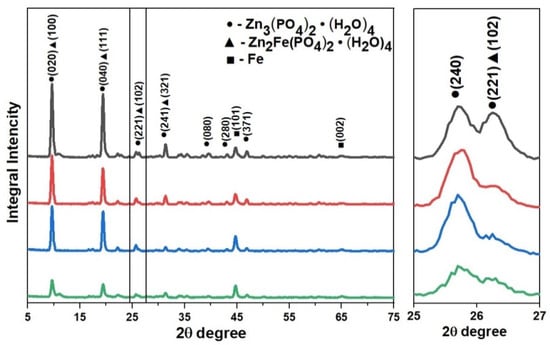 2O (phosphophyllite, JCPD file # 29-1427). In the studied samples of coatings with GO additives from 0.3 to 1.2 g/L GO, the peak intensities of Zn