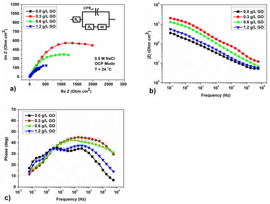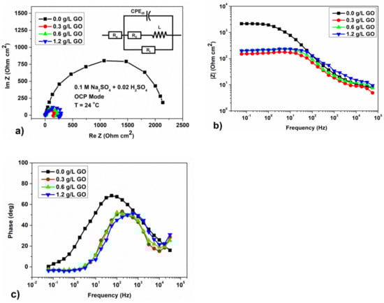 Figure 6c, a higher phase angle in the high frequency range up to 10 kHz, as well as the best corrosion resistance characteristics, were obtained on a sample with an addition of 0.3 g/L GO. The results obtained in [