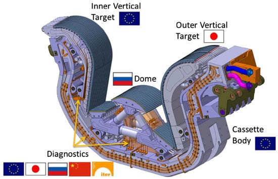 Specifically, the divertor will consist of 54 divertor cassette assemblies (CAs) operated by remote handling (Figure 3). Each of these CAs includes a cassette body (CB) and three PFCs, namely the internal and external vertical targets (IVT and OVT) and the dome. In addition, each of these modules will house diagnostic components for plasma control, evaluation and optimization [11,12].