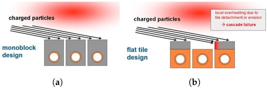 Main PFC designs for ITER. The charged particles depositing their energy are guided by the magnetic field lines. (a) Monoblock design. (b) Flat tile design. Reprinted from Ref. [12].