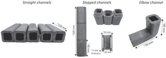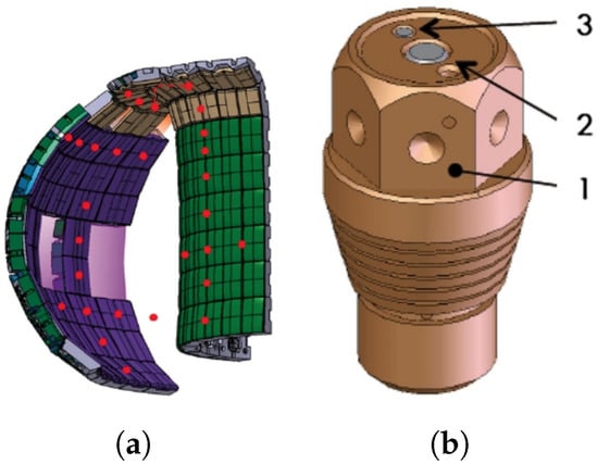 These models (Figure 4) consist of modules that have been machined from a PFM and attached to a water-cooled heat sink made of a metalic alloy. The joints between the PFM and the heat sink must acquire very high mechanical strength to tolerate the high temperatures and keep the modules uniformly in position. Each of these is equipped with a cylindrical hole necessary for the junction between the PFM and the heat sink—usually made of CuCrZr.