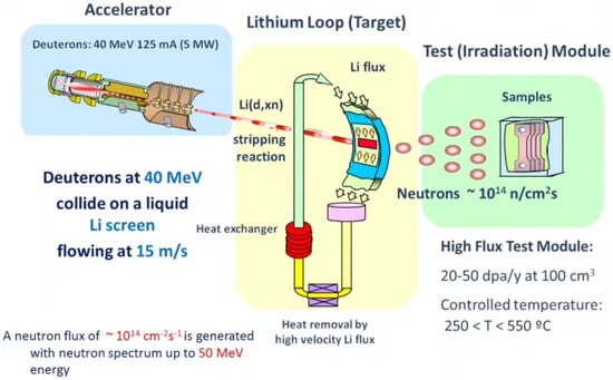 - Ibarra, A.; Arbeiter, F.; Bernardi, D.; Krolas, W.; Cappelli, M.; Fischer, U.; Heidinger, R.; Martin-Fuertes, F.; Micciché, G.; Muñoz, A.; et al. The European Approach to the Fusion-Like Neutron Source: The IFMIF-DONES Project. Nucl. Fusion 2019, 59, 065002. [Google Scholar] [CrossRef]