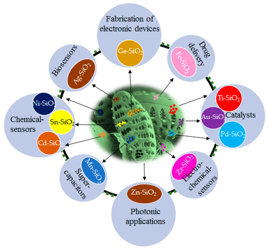 Researchers have described some methods like sol-gel, laser ablation, etc., to produce silica particles in laboratory condition [48,49,50]. One of the main advantages of diatoms exploitation in nanobiotechnology is the cost-effectiveness of obtaining complicated structures like three-dimensional (3D) nano-/microstructures that self-replicate at high rates with outstanding reproducibility, resulting in complex geometries and architectures that are difficult to achieve even with the most sophisticated fabrication techniques [51,52,53]. However, silica may not be the best choice for certain applications. Various approaches have been devised over the years aiming at the fabrication of realistic frustule replicas following an eco-friendly route by metabolic incorporation of metal ions in diatom cells, which does not allow the total replacement of silica. However, silica associated metal particles are more acceptable in catalysis. Nowadays, immobilization of noble metals like gold, silver, etc., to construct active and stable catalysts on solid support is the focus of significant research [54,55]. DE is commonly employed as an ideal support in the construction of hierarchical porous catalysts due to its porous structure, low density, large surface area, and abundant sources [56,57,58,59]. All possible applications of metal-doped diatom frustules are shown in Figure 1 and Table 1.