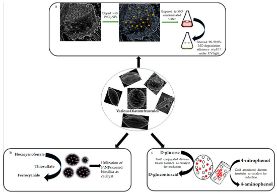 Showing catalytic activities of various metal associated diatom-based biosilica. (a) Schematic diagram on methyl orange removal by palladium chloride doped biosilica of Pseudostaurosira trainorii, observed by Sprynskyy et al., 2021 [75]. (b) Platinum nanoparticles coated frustules showed 10 times more catalytic efficiency in redox reaction between hexacyanoferrate(III) and thiosulfate than platinum collloids, confirmed by Jantschke et al., 2012 [76]. (c) Catalytic abilities of AuNPs loaded biosilica in oxidation and reduction have been documented by Fischer et al., 2016 [63] and Yu et al., 2010 [64] respectively.