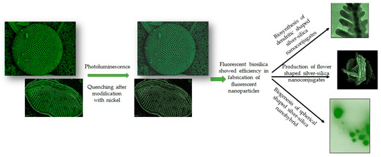 Schematic representation on biogenesis of biosilica-inspired fluorescent nanostructures. Representation of reduced photoluminescence in diatom frustules after modification with nickel as reported by Townley et al., 2007 [85]. Depiction of diatom mediated Production of dendritic; flower and spherical shaped, fluorescent silver-silica nanoconjugates as reported by Bose et al., 2021 [60] and Roychoudhury et al., 2021 [102] respectively.