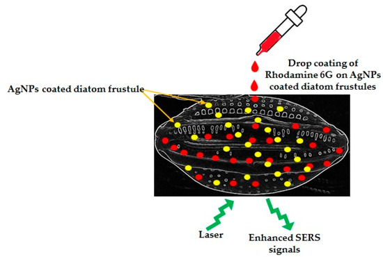 Schematic representation of enhanced SERS signal with 2 times stronger optical extinction and 4 times higher sensitivity of Rhodamine 6G while using AgNPs loaded diatom frustules as a substrate, recorded by Ren et al., 2013 [61].