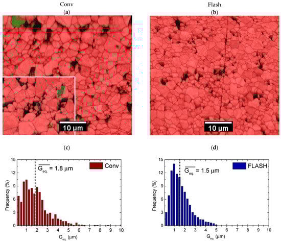 EBSD-phase mapping (a,b) and equivalent grain size (Geq.) distribution (c,d) deduced from them for conventional (a,c) and Flash (b,d) sintered KNN ceramics. Red colour in the maps indicates the indexation with JCPDF file 01-085-7128, K0.5Na0.5NbO3 orthorhombic symmetry phase, and green colour with file 04-007-9405, K0.8Nb5O15 tetragonal secondary phase. Inset of (a) reveals another EBSD mapping for Conv KNN with the secondary phase being systematically indexed in several grains.