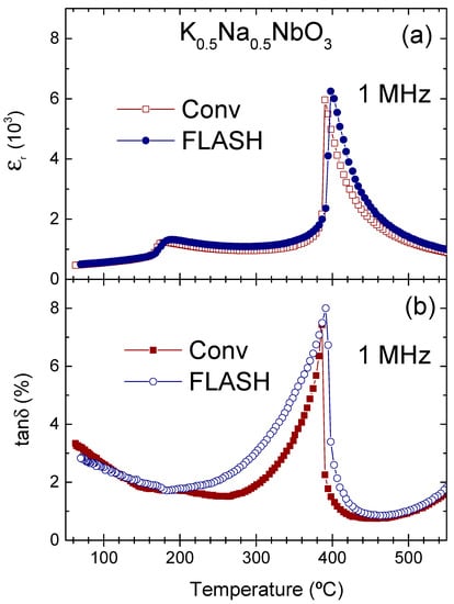 Real part of the relative dielectric permittivity, εr (a), and dissipation factor, tanδ (b), of conventionally (squares) and Flash (circles) sintered KNN ceramics measured as a function of temperature, at 1 MHz, on cooling.