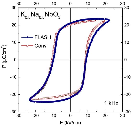 A slight superiority of Flash ceramics over Conv KNN is visible as well in the room-temperature polarization (P) behaviour as a function of the applied AC (1 kHz) electric field (E), illustrated in Figure 4. At a rather similar coercive field of 10 kV/cm, remnant polarization values of 20 and 21 μC/cm2 are obtained for Conv and Flash ceramics, respectively. In terms of the piezoelectric performance at room temperature, d33 piezoelectric coefficient of 115 for Conv KNN is also slightly lower than 117 pC/N for Flash ceramics.