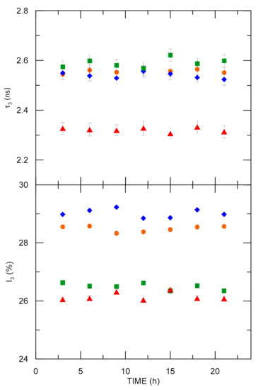 From a temperature of 18 °C, the samples were cooled down to −150 °C, and a stability test at this temperature was performed. A number of materials (including polymers) show the instability of PALS parameters as a function of exposure time to irradiation, which is explained by the low-temperature electron trapping effect [47,48,49,50,51]. This effect is manifested by an increase in the intensity of the o-Ps component as a function of time. This effect was not observed in any of the investigated matrixes demonstrating high stability at low temperatures (see Figure S4, supplementary material).