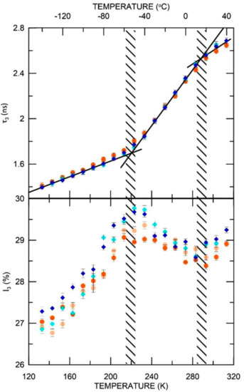 The temperature dependence of the annihilation parameters can be used to obtain additional information on the material properties, such as transition temperatures (phase and dynamic transitions). Combining PALS with other techniques, e.g., dilatometry [35], the shape of the pores or the anisotropy of their extensibility can also be obtained [36].