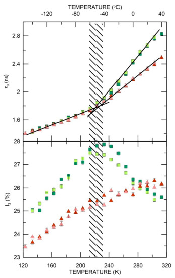 The effect of exposure of samples to drastic changes in temperature was investigated. As mentioned above, low temperatures did not affect the stability of the systems. The nanostructure of the virgin sample and the stress sample (subjected to the process of cooling down to −150 °C and then reheated to +40 °C and then to RT) remained unaltered, as reflected in the lifetime and intensity of o-Ps. The spectra for the virgin sample, samples at −150 °C, and samples reheated to RT were summed up and analyzed by the LT and MELT software.