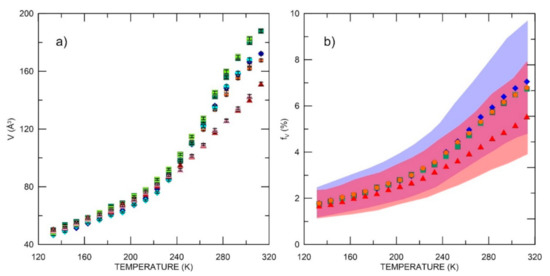 Free volume (a) and relative free volume fraction (b) as a function of temperature in increasing temperature: ELO/PI—orange dots, ELO/10RD1/PI—dark blue, diamonds, AESO/VDM—dark green squares, AESO/VDM/DMPA—red triangles; and decreasing of temperature: ELO/PI—creamy dots, ELO/10RD1/PI—light blue diamonds, AESO/VDM—light green squares, AESO/VDM/DMPA—pink triangles. In the figure to the right, the points correspond to C = 0.0014. For C in the range 0.001 to 0.002, the blue and red areas marked results for ELO/PI and AESO/VDM/DMPA, respectively.