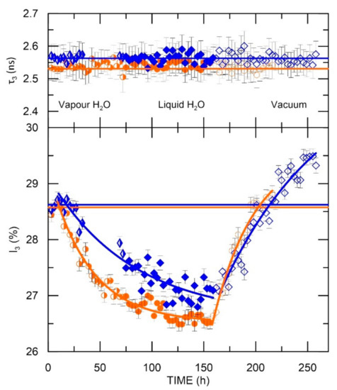 The water sorption/desorption process in the samples is shown in Figure 7 and Figure 8. The horizontal lines are the reference values of PALS parameters for samples at 18 °C before conducting the above-mentioned process. Compliance of these reference levels with the initial PALS parameter values in Figure 7 and Figure 8 (first points) confirm that the temperature has no destructive effect on the samples. The reference level allows as well analysis of the impact of the presence of water molecules on the sample nanostructure. Figure 7 and Figure 8 display three different areas that are correlated with the procedure described above. It is worth mentioning that water molecules are paramagnetic, i.e., the ortho-para conversion process is inevitable. However, the conversion effect was not introduced by oxygen molecules from the air dissolved in the water—the freeze-thawing was used to remove oxygen from the environment and avoid its effects in the measurements.
