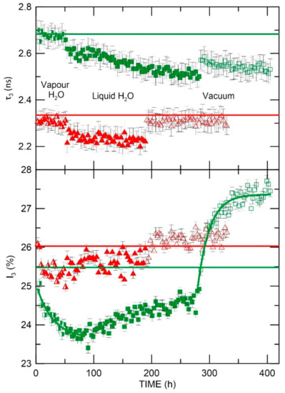 During desorption in a high vacuum, not only water but also other volatile substances are removed, and therefore I3 in the final state is not identical to the initial one. The slight decrease of τ3 during desorption, as well as the decrease of τ3 in the final state compared to the initial value, indicates that this is not simply the desorption of water but that the properties of the matrix have been modified.