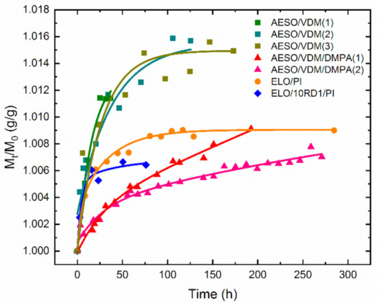 Compared to other samples, the AESO/VDM/DMPA showed an increasing trend over the entire measured time interval. In the case of later repeated swelling after about 50 h of sorption, this sample showed a lower weight gain compared to the primary swelling. Sample AESO/VDM, which is similar in composition but synthesized without the photoinitiator DMPA, clearly shows a higher water sorption capacity, which can be explained by the less cross-linking efficiency. However, we found that the structure of the AESO/VDM network was much more stable since the parameters remained constant even after the third swelling cycle. In the sample AESO/VDM/DMPA, which has a higher cross-linking density, it can be stated that the network bonds are less stable. This explains the unsaturated course of the dependence M(t) and also the decreased values of M(t) in the second swelling cycle.