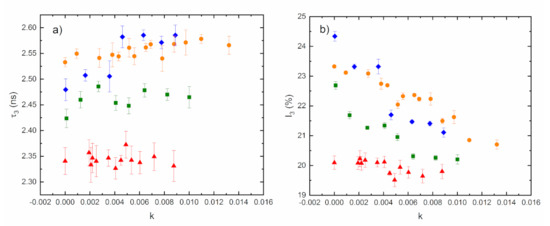 The annihilation characteristics of individual samples depending on the amount of water (expressed by filling coefficient k) were obtained. The filling coefficient is defined here as: k = Mwater/(Mwater + Mdrymatrix), where Mwater is the mass of water inside of the sample and Mdrymatrix is the mass of the polymer sample with minimal value. The results for all samples for both the o-Ps lifetime and their relative intensity are shown in Figure 10.