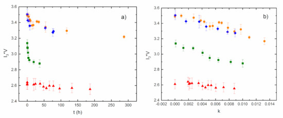 The reduced free volume fraction fv/C for the investigated samples as a function of time at swelling (reconstructed) (a) and as a function of water content expressed by k (b) AESO/VDM squares, AESO/VDM/DMPA triangles, ELO/PI dots, and ELO/10RD1/PI diamonds.
