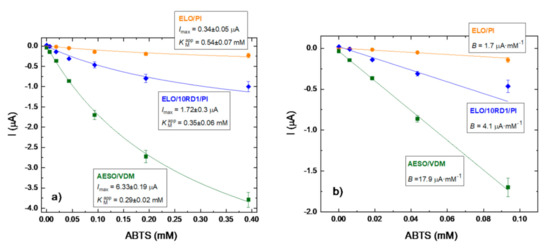 The calibration curves shown in Figure 12 correspond to the typical chronoamperogramms (Figure S11, supplementary material) of the bioelectrodes constructed by means of ELO/PI, ELO/10RD1/PI, as well as AESO/VDM. Both of them have demonstrated a significant difference in their operational properties. The bioelectrodes based on AESO/VDM have shown a 3.7-fold higher Imax value compared to the one based on ELO/10RD1/PI and more than 18-fold higher than ELO/PI-modified bioelectrodes (6.33 µA vs. 1.72 µA and 0.34 µA, respectively). The listed electrodes were characterized by the KMapp values: 0.29 mM; 0.35 mM; 0.53 mM of ABTS, respectively. Interestingly, KMapp value for AESO/VDM matrix is the same when compared with KM of ABTS substrate for laccase from T. versicolor in solution (0.29 mM) [53]. Such a high affinity of the constructed bioelectrodes indicates very comfortable conditions for the immobilized enzyme catalysis in the polymeric matrix. The sensitivity (recalculated as a relation of calibration slope B to working electrode area 7.3 mm2) is the most important biosensor characteristic and was found to be: 2452 A⋅M−1⋅m−2 for AESO/VDM, 562 A⋅M−1⋅m−2 for ELO/10RD1/PI, and 233 A⋅M−1⋅m−2 for ELO/PI polymer matrix (Figure 12b and Table 4). Hence, bioelectrodes based on AESO/VDM matrix possessed 4.4-fold higher sensitivity when compared to ELO/10RD1/PI and one order higher compared to ELO/PI matrixes, respectively. The linear range of the bioelectrodes was found in the frames of 10 µM to 10 mM of ABTS (Figure 12b, Table 4).