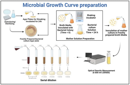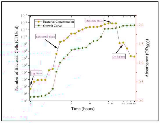 The selected Gene of Bacillus species for this study was Bacillus pumilus (accession No. #MN865840, NCBI GenBank), which has negative urease activity [5]. Bacillus pumilus, typically found in soil, is a Gram-positive, rod-shaped, and endospore-forming bacterial strain. Because of the production of protective endospores, it can withstand high pH, making it excellent for cementitious repair. The stocks of strain were revived from a −80 °C glycerol solution and streaked on nutrient agar plates with pH 7.5, comprised of 5 g peptone, 15 g agar, 2 g yeast extract, 5 g chloride, and 1 g Lab-Lemco Powder. The plates were stored for 24 h in a static incubator at 37 °C. Microbial colonies emerged on Petri dishes after 24 h. For the germination of bacterial culture, Tryptone soy broth (TSB) medium with pH 7.3 ± 0.2 at 25 °C was autoclaved at 121 °C for 15 min. The inoculum of the bacterial colony from the Petri dish was inoculated in TSB medium, comprised of 3 g papaic digest of soybean meal, 2.5 g dextrose/glucose, 17 g pancreatic digest of casein, and 2.5 g dipotassium hydrogen phosphate. Then, the cultured medium was moved to a shaking incubator at 37 °C. To set the optimum growth concentration, the growth characteristics of Bacillus pumilus in the TSB medum were tabulated, using the standard protocol by Prescott et al., 1999 [27]. The detailed microbial growth curve preparation is presented in Figure 1, and started with growing the microbial culture on nutrient agar plates. After that, the fresh bacterial culture was transferred to the broth solution. The solution was transferred to the shaking incubator set at 120 rpm and 37 °C, followed by subsequent measurement of the optical density value. Along with OD measurement the cell concentration value corresponding to each OD value was also measured using the serial dilution method. Those OD and cell concentration values are plotted in Figure 2.
