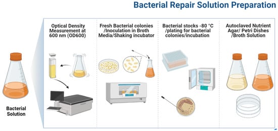 After capturing the growth characteristics of Bacillus pumilus, a microbial repair solution was devised by inoculating a freshly prepared bacterial colony in autoclaved TSB medium and transferring it to the shaking incubator for 18–20 h at 37 °C, at 120 rpm. The optical density of cultured medium was measured using a SPECORD 200 plus spectrometer at a 600 nm wavelength. The microbial repair solution used in this study had an OD600 value of 1.3, with a bacterial concentration of 2.9 × 1010 Cells/mL. The complete protocol followed for bacterial repair preparation is presented in Figure 3. Previous investigations and bacterial strain growth characteristics were used to determine the OD value and cell concentration [5,27,28].