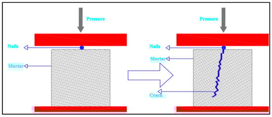 On the 28th day after casting, the mortar specimens were withdrawn from the water tank to obtain distinct crack features. The specimens were left on the table for 10–15 min to allow the surface moisture to evaporate. The samples were then placed in a compression machine, with a steel nail positioned laterally in the center of the top surface. Figure 5 shows a schematic of fracture formation in a mortar cube. When an obvious surface crack appeared, loading was halted. After the cracks had formed, the samples were ready for repair.