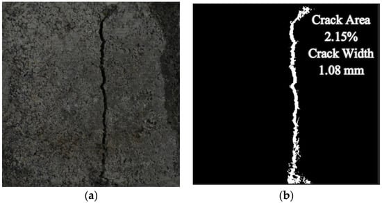 Healed crack areas represent the healing impact of the repair solution. It is critical to assess the healed area to determine the effectiveness of the repair process. A digital image processing approach was used to extract the crack features [31,32,33,34,35]. Before the application of any repair, high-definition images were captured with subsequent crack feature extraction. After loading the image into MATLAB, an image processing algorithm was applied. Initially, an RGB (Red–Green–Blue) image was transformed into a binary image using OTSU-based image thresholding algorithms as shown in Figure 6 [33,36]. The image was cleaned after the crack region was identified. No-crack objects, noisy pixels, and places other than the intended crack were deleted, as well as the picture’s edge smoothing. After removing unwanted pixels, the crack width (mm) and crack area percentages (%) were calculated using Equations (8) and (9). Because measurements on the edges are questionable, the core 40 mm crack length was evaluated, and a 5 mm portion on the edges was removed from the parameter acquired via boundary extraction. The complete protocol for image processing is shown in Supplementary Materials S1.