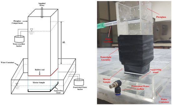 Initially, the samples’ crack features were assessed using image processing. The samples were then submerged in water for 24 h before being tested for permeability. The test specimen was wrapped with ultra-sealing tape for to render it watertight after soaking, leaving the top and bottom surfaces exposed. The plexiglass container was fixed to the top of the specimen after sealing, as shown in Figure 7. Watertightness was ensured by placing a rubber seal between the plexiglass and the sealed sample. A water tightening seal was wrapped around the sample and plexiglass after it was fitted to make the total assembly completely waterproof. The plexiglass-mounted sample was put on a supporting platform inside a water-filled tank. By mounting a hole for water flow in the upper compartment and a water container for penetrated water, a steady water head was maintained. A constant supply of water was maintained throughout the experiment. The amount of water flowing out of the sample was measured at 2 h, 4 h, and 6 h intervals to estimate permeability using Equation (10):