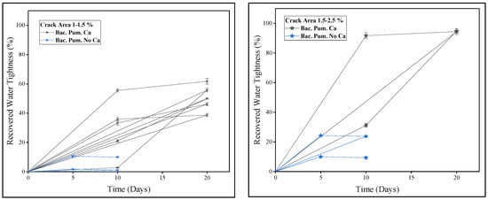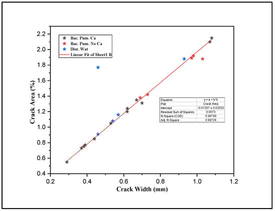 Figure 8 represents a strong linear relationship between crack width (mm) and crack area (%), obtained from cracked mortar samples to be treated with biodeposition and distilled water treatment using image processing. This, consequently, leads to the use of average crack width as a representative crack size for the data analysis of all the formulations under study. The maximum and minimum crack sizes for biodeposition repair were 0.29 mm and 1.08 mm, respectively, while the maximum and minimum crack sizes for the water-treated formulation were 0.46 mm and 0.93 mm.