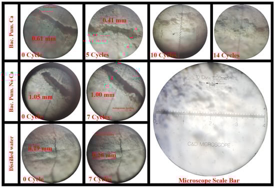 All of the cracked sample’s top surfaces were repaired utilizing biodeposition and distilled water channels, and the extent of healing is shown in Supplementary Materials S3. Image processing and an optical microscope were used to assess the healed crack area after various cycles of restoration procedures.
