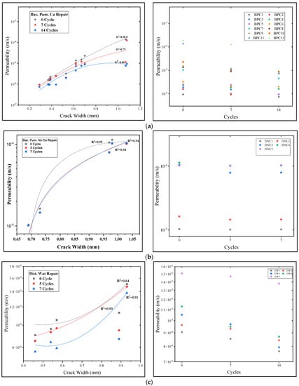 - The biodeposition treatment significantly decreased the permeability of samples of cracked mortar. Before repair, the permeability of cracked mortar samples with average fracture widths of 0.29 to 1.08 mm ranged from 9.4603 × 10−7 to 1.8227 × 10−4 m/s. A reduction in permeability between 7.4396 × 10−7 and 9.3953 × 10−6 m/s was observed in mortar samples after 14 cycles of biodeposition repair. However, treatment with bacterial solution and distilled water alone did not significantly reduce sample permeability. This is due to the inefficiency of autogenous crack healing caused by cement hydration for larger crack widths.