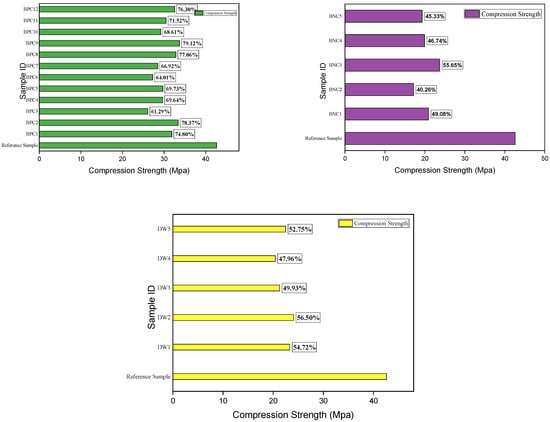The maximum compressive strength was recovered from samples treated with biodeposition repair with a Ca source, as indicated in Supplementary Materials S4. Other formulations, such as those using a bacterial solution only and distilled water, yielded lower compressive strength recoveries. As shown in Figure 14, compressive strength was regained using “Bac. Pum. Ca” repair in the range of 61–79%. As previously stated, each increasing cycle increases the amount of calcite precipitation on the sample surface and within the cementitious matrix, resulting in greater compactness [2]. The sample’s compressive strength increases as the compactness increases, whereas the recovered compressive strength was 40–55% for the sample treated with distilled water and 47–56% for the sample treated with BS repair, respectively (Figure 14).