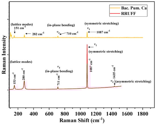 - The forensic analysis of the healing product from biodeposition treatment with Ca-lactate confirmed the presence of calcites. The obtained RAMAN spectra were compared with the trends of pure calcite from the RRUFF database. The obtained vibrational modes, such as internal-mode Ag, due to v1 stretching, had lower intensity Eg due to in-plane bending mode v4; transitional and rotational lattice modes; lattice mode peaks at 1087 cm−1 and 710 cm−1, and below 300 cm−1, 282 cm−1, and 151 cm−1, respectively. These resultant modes and respective peaks resemble calcite from the published literature.