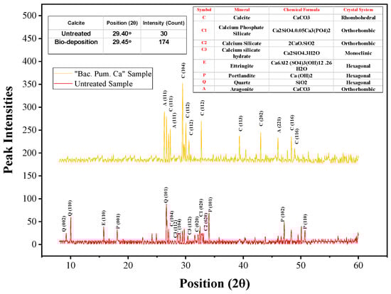 The XRD of the healing precipitates was recorded from a 3 to 60° orientation angle (2θ) with a wavelength of 1.54 Å. The obtained peaks from XRD analysis were used to study the morphology and phase purity of the collected healing product. Furthermore, a comparison was drawn with a sample that was not treated with biodeposition treatment. The obtained peaks from the untreated samples were primarily composed of quartz, ettringite, portlandite, low calcite, etc as given in Figure 16. The presence of low calcite content in the untreated sample, with a peak intensity of 30 counts at a 29.40° orientation, is in accordance with the published literature [7]. On the contrary, the collected precipitate from healing showed an intense peak of calcite. The obtained peaks in the XRD analysis of the healing product showed the most dominant peak of calcite (rhombohedral morphology) with a peak intensity of 174 at a 29.45° orientation. In the published literature, pure calcite XRD analysis resulted in a dominant peak at a 2-theta (2θ) diffraction angle of 29.30° [49]. The obtained peaks in our analysis resemble pure calcite, confirming the presence of calcite [2,7,10,49].