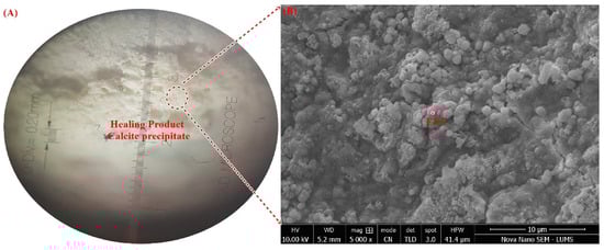 However, for samples treated without a Ca-based food source, the extent of healing after five and seven cycles was very low due to the lack of a Ca-based food source in biodeposition repair (Supplementary Materials S3c). This is mostly due to the lack of an excess Ca source available for calcite precipitation by bacteria. The maximum percentage of the healed area was only 11%, which is extremely low. As previously stated, the microbial metabolism releases CO2, which increases carbonate synthesis (CO3−2) [44]. Calcite is formed when these carbonates react with calcium. The lack of a Ca source in this formulation did not satisfy the constraint. Autogenic healing—which can occur as a result of the hydration of unhydrated cement particles inside the cementitious matrix, soluble hydrate deposition, or Ca(OH)2 carbonation—could be the cause of the small permeability reduction [1]. The minor permeability drop could be because the samples were just one month old before treatment. The SEM image in Figure 9 reveals the presence of Ca(OH)2 and unhydrated cement particles. In the presence of Ca(OH)2, CO2 is released via microbial metabolism and aid carbonation.
