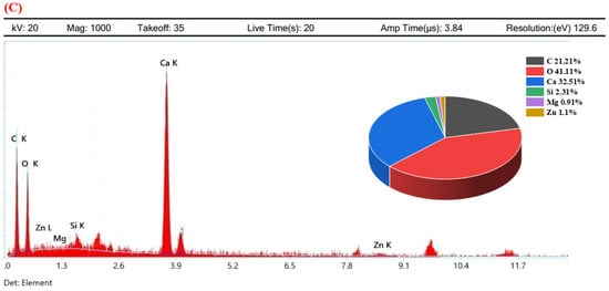 Further, the surface morphology and elemental composition of the healing precipitate of biodeposition treatment are displayed in Figure 17. Micrographs obtained from SEM analysis resulted in a dense calcite crystal with spherical morphology. The crystal morphology of calcite depends upon the food source and type of bacteria [3]. In this study, an irregularly stacked crystal of calcium carbonate with amorphous morphology was determined. This crystal of calcite perfectly resembles the calcite precipitate reported in the literature for Bacillus species with Calcium lactate [5,50]. After morphological confirmation, the elemental composition of these crystals was evaluated using spot-EDS (Figure 17). The elemental mapping obtained in the EDS study was primarily composed of high percentages of C, O2, and Ca confirming the presence of calcite in healing material [2]. Small percentages of Zn, Si, and Mg were also detected, which could be due to the hydration product of cementitious constitutes in mortar. The high Ca content from the EDS of biodeposition healing products was also verified in the literature [5,10]. Thus, forensic evaluation using RAMAN, XRD, SEM, and EDS confirms the presence of calcite in the healing product of the repaired crack area using biodeposition repair with a Ca source.