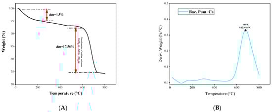 For thermogravimetric analysis (TGA), weight loss occurred with increasing temperature. TGA is a type of thermal analysis that looks at how a substance’s chemical and physical properties vary as temperature varies. The calcite crystal disintegrated when heated between 600 and 850 °C, resulting in weight loss due to CO2 release (Equation (14)) [1]. The biodeposition material was heated between 0 and 1000 °C at a rate of 10 °C/min and resulted in mass depletion compared to earlier studies [1,2].