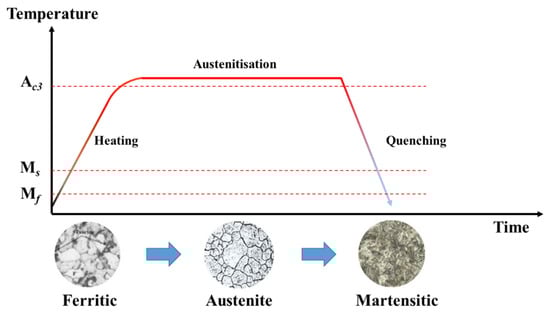 With the increasing requirements for energy-saving and safety, ultra-high-strength steel (UHSS) with excellent comprehensive properties of strength, toughness, ductility, and fatigue is widely used in the automobile industry [1,2,3]. Hot stamping is the most effective method to produce UHSS components [4,5]. The conventional hot-stamping process of UHSS is shown in Figure 1. Firstly, the UHSS sheet was heated up to the austenitizing temperature (AC3) and held for a certain time, so that the original ferrite was completely transformed into uniform austenite. Then the sheet was transferred to the die for hot forming. Meanwhile, the temperature of die was dropped through the water-cooling system to obtain a large temperature gradient between the die and sheet, and a holding pressure was continually applied on the sheet to ensure sufficient contact between the die and sheet [6]. Finally, the martensite transformation of the sheet was completed during the quenching process, and components with a fully martensitic structure were obtained. Although 100% martensite provides extreme strength for components, some components (such as the automobile B-pillar) also simultaneously demand the zone with high ductility to meet the impact energy absorption requirements [7,8,9], as shown in Figure 2. That is, it is difficult for the components with a single mechanical property to simultaneously satisfy the requirements of different serving conditions, as this greatly limits the application of the hot stamping of UHSS. Therefore, it is urgent to design the mechanical properties of components according to their serving conditions.