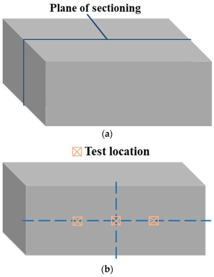 Schematic representation for (a) cutting plane of stripe specimen, (b) locations for microhardness test, and (c) locations for microstructure observation.