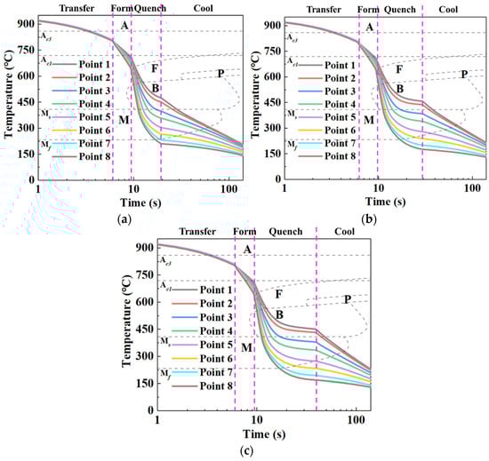 Figure 9 exhibits the temperature history curves for sheet at eight temperature measuring points under different quenching times of 10 s, 20 s, and 30 s. It can be seen from Figure 9 that the curves can be divided into four stages, namely transferring, forming, quenching, and cooling. In Figure 9, A represents the austenite zone, F represents the ferrite transformation zone, B represents the bainite transformation zone, M represents the martensite transformation zone, and P represents the pearlite transformation zone. During the transferring stage, the temperature of the sheet (P1 to P8) uniformly dropped. During the forming stage, the temperature of the sheet began to differentiate due to the temperature gradient of the die, and an obvious feature of the temperature gradient was gradually formed. During the quenching stage, the temperature differentiation and temperature gradient of the sheet were more notable. It is worth emphasizing that, since the heat exchange between the sheet and die gradually slowed with the temperature of sheet decreasing, the temperature gradient of the sheet remained relatively constant with the further increasing of the quenching time. During the cooling stage, the temperature of the sheet dropped with the increasing time. Comparing the temperature-history curves at different quenching times, we found that the temperature of the sheet (P1 to P8) exhibited the same variation trend under different quenching times, and the cooling rate of the sheet (P1 to P8) was extremely slowed after quenching for 10 s, which is equivalent to the heat-preservation process. Nevertheless, it was worth noting that, in the quenching stage, for P1 to P8, the time of the phase transition increased with the increasing quenching time, which significantly affected the sufficiency of non-diffusive transformation.