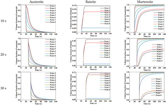The curve of microstructural constituents, including austenite, martensite, and bainite, of the sheet (P1 to P8) over time is plotted in Figure 10. It was known from Figure 10 that the microstructure of the sheet (P1 to P8) was austenite before the quenching stage. The reason was that the temperature of the sheet dropped slowly under air-cooling, and there was no phase transformation. As can be seen from Figure 9 and Figure 10, during the quenching stage, the temperature curves of P1 and P2 were in the bainite transformation zone, resulting in the transformation from austenite to bainite occurring and the volume fraction of bainite increasing. The temperature curves of P3 to P8 were in the martensitic transformation zone due to the large cooling rate, leading to the transformation from austenite to martensitic occurring and the volume fraction of martensite increasing. Comparing the variation curves of the volume fraction of microstructures over time at different quenching times, it was obviously found that the volume fractions of austenite, bainite, and martensite exhibited the same variation trend under different quenching times. Furthermore, with the increase in quenching time, the longer time of the temperature curves of P1 and P2 passed through the bainite transformation zone, resulting in the transformation from austenite to bainite completely occurring, and the volume fraction of bainite was higher.