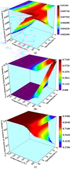 Three-dimensional mapping surfaces of (a) austenite, (b) bainite, and (c) martensite, with quenching time and the temperature of the die.