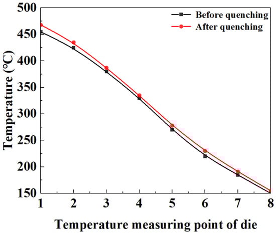 Temperature distribution of eight temperature measuring points of die before and after quenching.