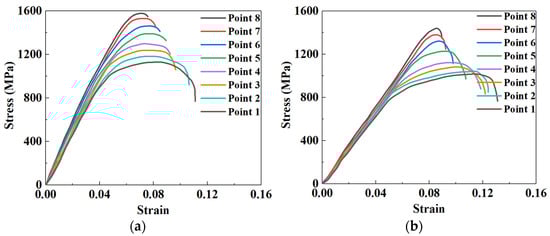 The stress–strain curves from the tensile test at the corresponding temperature measuring point of sheet were shown in Figure 13. It can be seen from Figure 13 that the stress–strain curves for P8 to P1 present gradient distribution characteristics under the same quenching times. For all points, the peak stress successively decreases from P8 to P1, and the stress increases rapidly with the increase of strain first, and then decreases slowly. As for a fixed point, the peak stress decreases with the increasing quenching time.