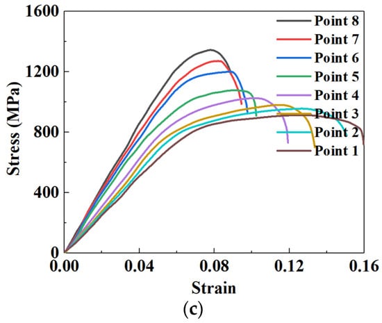 Stress–strain curves of different tensile specimens under the quenching time of (a) 10 s, (b) 20 s, and (c) 30 s.