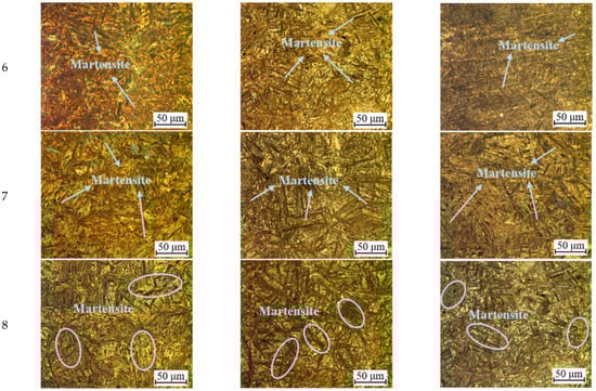 Figure 14 presents the microstructures of sheet (P1 to P8) under the quenching times of 10 s, 20 s, and 30 s, respectively. As shown in Figure 14, the shape of martensite is lath, and the macroscopical dimension of martensite increases with increasing the temperature of die. The shape of bainite presents a gradual characteristic that bainite gradually changes from granular to double lenticular at a quicker cooling rate. It can be observed from Figure 14 that the martensite content increases with the increasing temperature of the die, and the bainite content decreases. On the other hand, as the quenching time increases from 10 s to 30 s, the martensite content of the sheet decreases, and the bainite content increases successively. At the same quenching time, the macroscopical dimension of martensite and bainite gradually becomes fine and dispersed. It can be summarized from Figure 14 that the required microstructures can be obtained by controlling the quenching time and the temperature of the die.